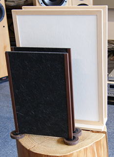 吸音・拡散ボード AB-1(S) サイズ W200×H300mm 12,800円(ペア/税込) AB-1(M) サイズ W300×H400mm 14,800円(ペア/税込) PCオーディオの流れに伴ってデスクトップで音楽鑑賞していらっしゃる ユーザーが増えてきました。狭い中にいろんな物を置かざるを得ない 状態で、スピーカーの状況はあまり贅沢を言えません。 特に小音量での音楽再生は、どうしても高域のヌケが悪く、低域はこもり がちになります。 AB-1は、シリーズ中最もコンパクトな製品でリアバスレフ小型スピーカー の後ろにセットするように考えられています。東京ブラインド社のフェルトーンを使い、 その吸音性能で中域から高域のエコー成分を抑えます。その分音が明解に分離します。 聴感上、音のヌケが良くなり、低域は、軽やかに情報量を上げて、下まで 伸びるように感じます。 |