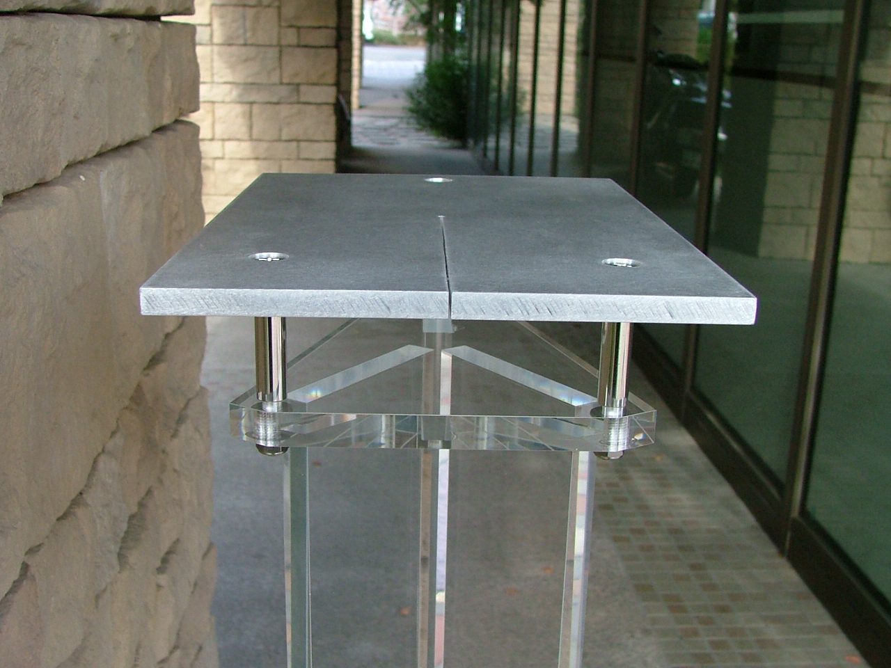 定格 天板部分:ステンレス合金#7075 脚部:アクリル重合接着構造 3点分離点接触支持 ネジ止め 底板部にスパイクあり。 高さ:70cm 天板サイズ:222cm X 330cm |