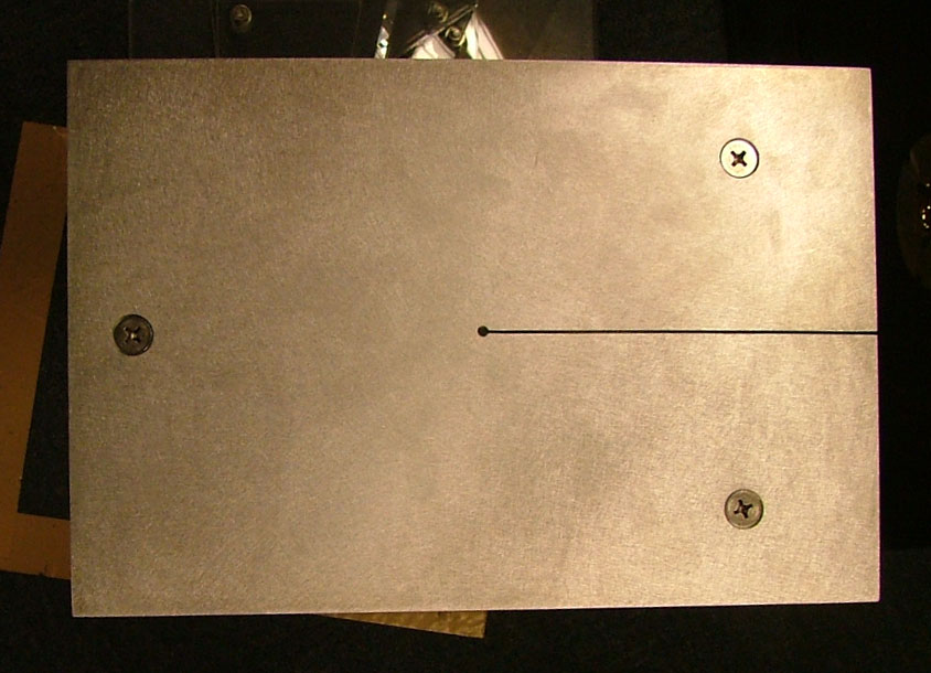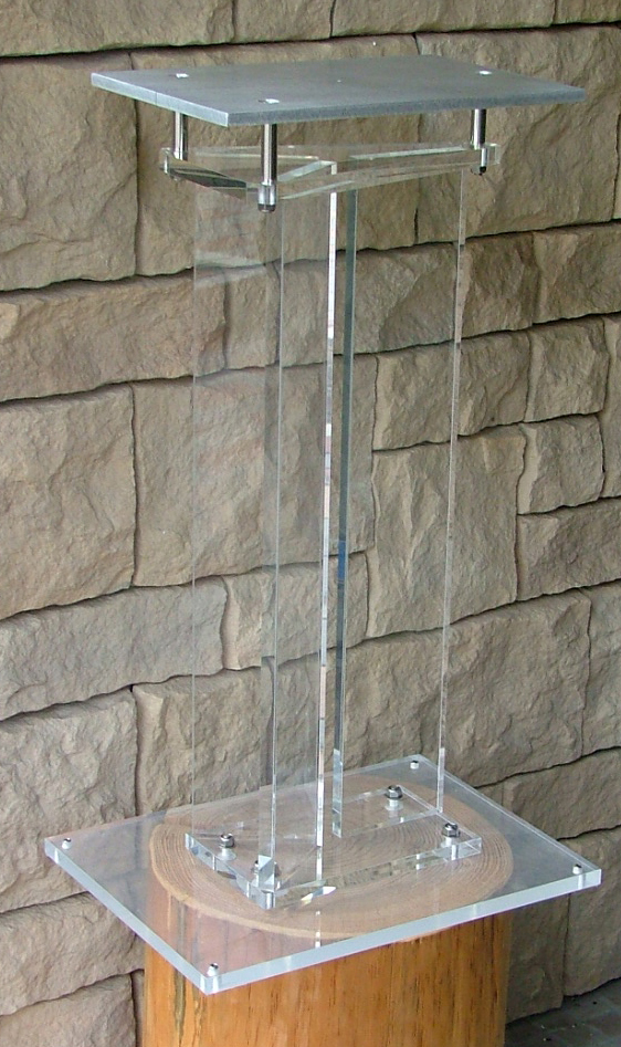 | 脚部がうまくいったので、コストと汎用性を考えてバイスを省略、 今度は、スピーカーが鳴らしている間、鏡面に仕上げるとスピーカーが エネルギーで後ろに動いていく現象が起きてしまいました。 天板鳴きのコントロールに切れ目を入れ、天板表面を少しブラスト加工し 摩擦を大きくし、滑らないようにしました。 さて写真をご覧になって、「強度は大丈夫?」思われた方も いらっしゃるでしょう。底版と中間ボードを繋ぐ角材との接合面ですが、 アクリルならではの重合接着とボルトを使用し必要な強度を確保しました。 |