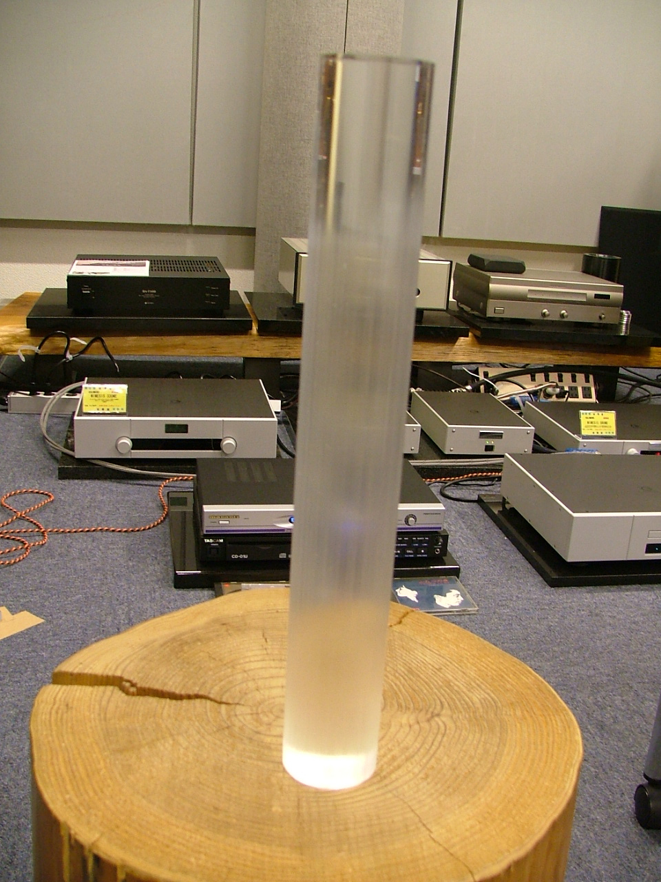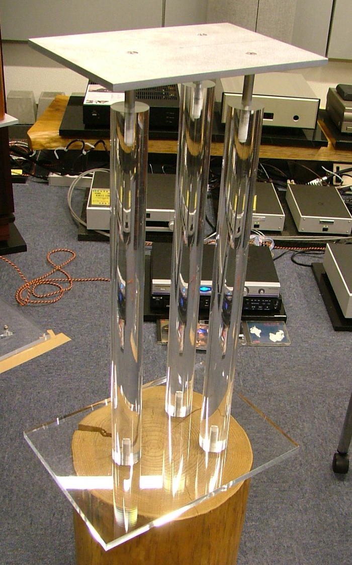 | ”The Base”の肝は後から発表されたインシュレーターボードでも お分かりの通り天板とそれを浮かす事によりコントロールしている事 なのです。 ですからグラスファイバー充填の4本の足は、ある程度鳴かない素材 であれば代用が効くであろう、そこでアクリルでやってみようという事に なりました。 最初は丸棒を使用した足の試作からでした。 設計は一緒ですからすぐに上がってきました。「こりゃ簡単だ」 喜んだのも束の間。試作の請求書を見てびっくり!(試作写真左) 殆ど ”The Base”と同じ金額です。この丸棒が曲者でした、 音質的に考えてキャストの50mm円柱を磨き上げるという物で、 アクリルとは言えキャストは通常の押し出しのアクリルに比べ、コストも 手間が掛かるということでした。(写真右) ここで、使用目的、強度等を業者さんに説明して出来上がってきた物 、修正した物が「DAEDALUS」に成りました。 |