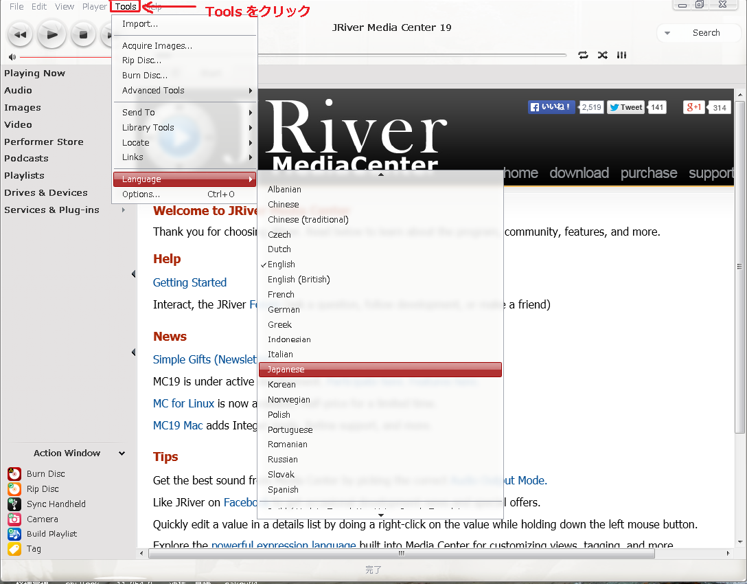 JRiverが起動したらまずは、日本語表示へ変更します。