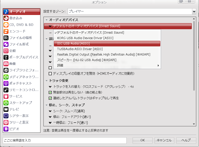 4 再生ソフトの設定パネルで、音声出力先をお使いのUSB/DACに設定する。