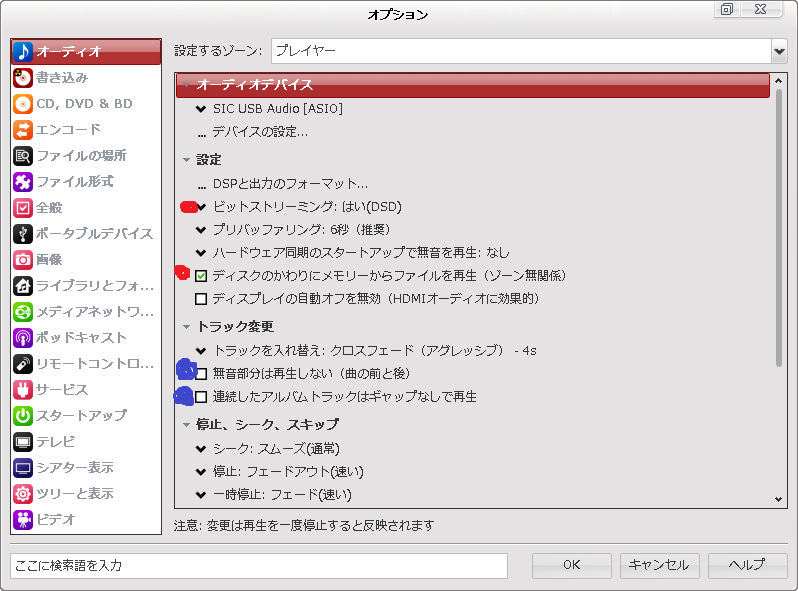 後の2項目は曲間に隙間を空けるかどうかの設定ですので、曲と曲の間を無くしたい場合は
