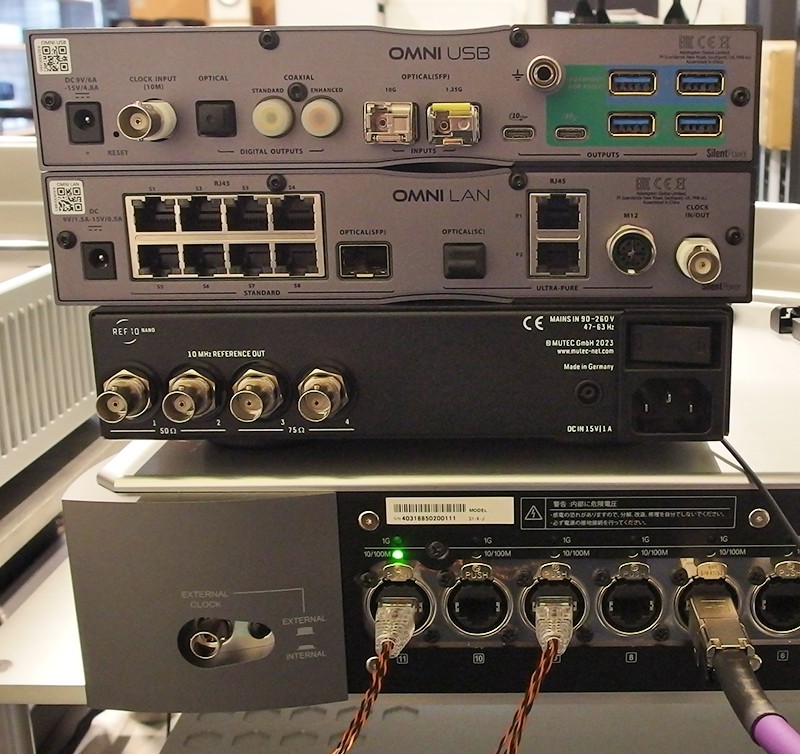 今回、接続を予定している機材達です。 上から順番に Silent Power OMNI USB 75Ω Silent Power OMNI LAN 75Ω REF10 NANO を挟んで DELA S1 50Ω となっていますので、50Ωと75Ωの両方の出力があるのは、本当に助かります。 さて、実際にこの3台へ REF10 NANO からクロックを供給して試聴しました。 粒子が細やかになり、静けさが上がります。 見事なほど外部クロック接続の良さが表現されました。 1台の機材へ供給するためだけに導入するとなると割高感を感じますが、2台以上への供給となればお得感が出てきます。 クロック入力が付いている機材を複数台お持ちの方にはおすすめできる良質なマスタークロックだと思います。 弊社決算時期と重なり、導入が後回しとなっている LUMIN の新型最高峰トランスポート U2X にも50Ωのクロックが接続出来ますので 弊社店頭では、4台の機材が接続可能となり、そのお得感が跳ね上がります。  |