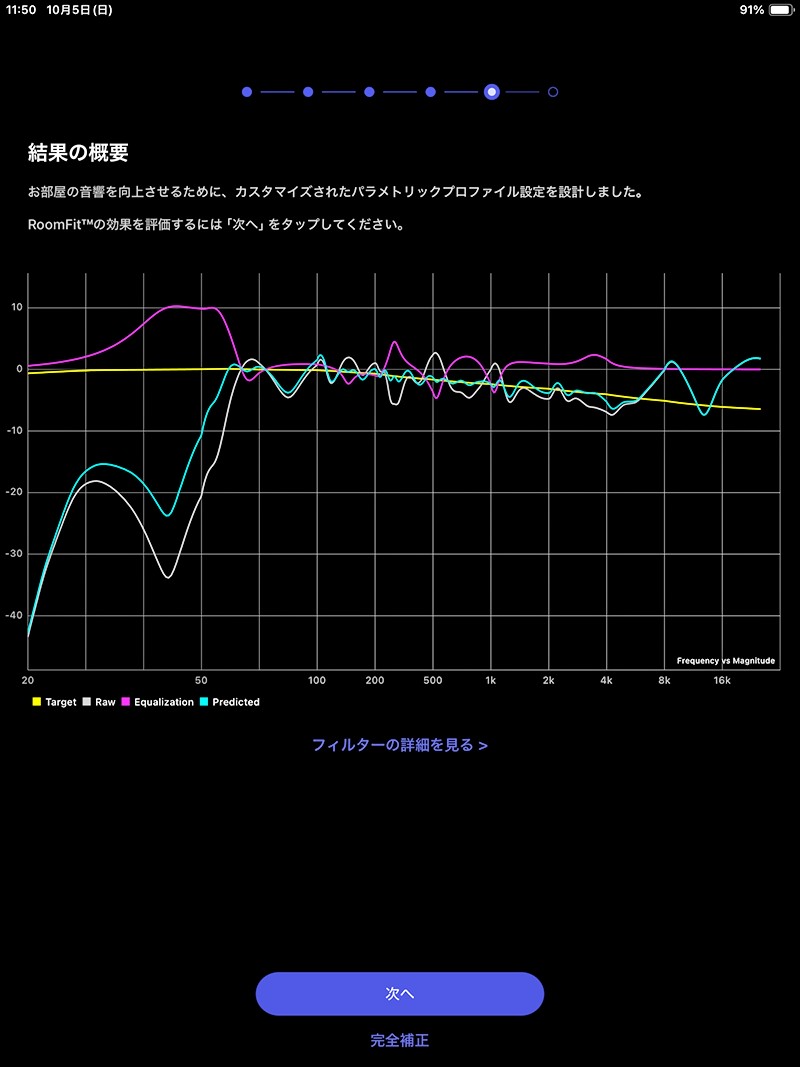 HDMI ARC 入力、RCA入力、サブウーハー出力等、入出力端子も充実しています。 電源ケーブルがメガネ3Pと汎用性に劣るのが少し残念ですが、付属電源ケーブルも悪くは無いので そこまで大きな弱点ではありません。 試聴は、高価なハブやルーターを使用せずに、汎用無線ルーターから飛ばした Wi-Fi 接続で行いました。 専用アプリを使用して Qobuz を再生しました。 9万円で購入できる、アンプ + ネットワークプレーヤーとして考えると、十分以上の実力です。 本格派の音作りで、直球勝負です。 低域を膨らませたり、高域に華やかさをプラスしたりせずに、入力された信号に忠実な音を出してきます。 そのため、ぱっと聞いた感じでは物足りなさを感じるかもしれません。 ですが、正確な再現を求める方にはこの良さをお分かりいただけると思います。 さらに、この機材には音響補正機能が内蔵されています。 お持ちのスマホやタブレットのマイクを使用して、部屋とスピーカーの特性に合わせて自動で 音響補正を行ってくれます。 凄い時代になりました。 この価格のモデルに、音響補正機能まで組み込まれているのです。 早速、店頭で試してみました。 測定は簡単で、補正処理込みで1分もあれば、測定から補正まで完了します。  |