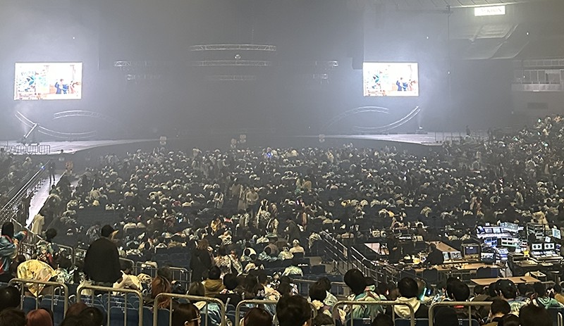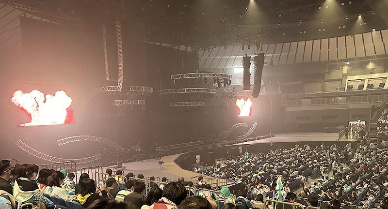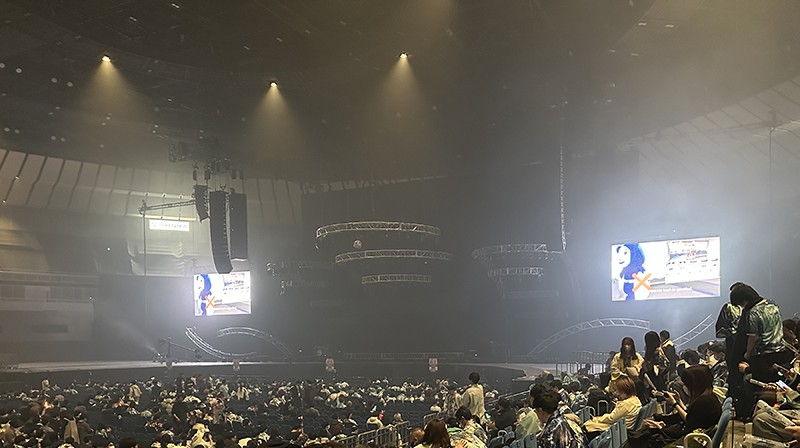 そして最終公演はステージほぼ正面の後方スタンド席です。 ステージから最も遠方の席となり、普通に考えると外れ席です。 ですが、私はこの席が最も期待値が高かったです。 何よりPA席のほぼ後ろという、音響的に最も期待出来る位置でした。 画像右手前の機材が多数置いてあるところがPA席ですね。 基本的に、ここで音響と照明の調整をするため、音と照明に関してはこの場所がベストポジションです。 実際、この最終公演が音響的にも照明的にもベストでした。 音が良いのは最初から予想できていましたが、照明の良さはこの位置からでないと 把握出来ないですね。 広いステージを端まで使用した照明はよく練り込まれており、曲のイメージに合わせて大変美しかったです。 また、2万本を超えるペンライトの海が一糸乱れず振れる様もこの位置からでこそ分かる美しさでした。 この規模のコンサートとなると、席位置の指定は出来ずに神様頼りとなりますが、複数のチケットが取れたりして 席の位置が選べる場合は、PA席の位置を考慮して選ぶのがおすすめです。 |